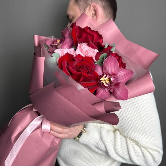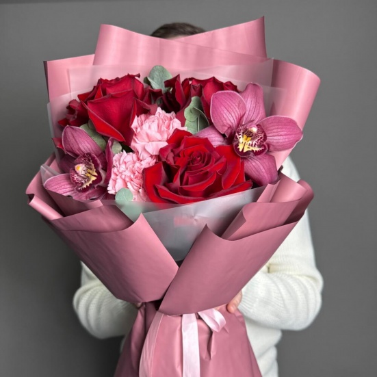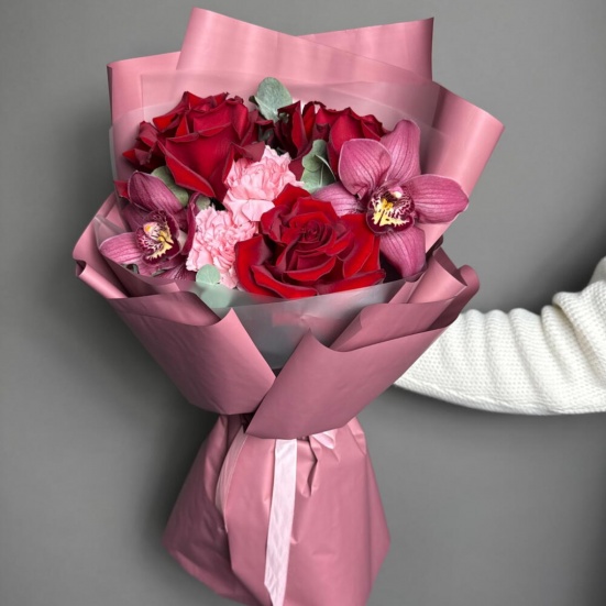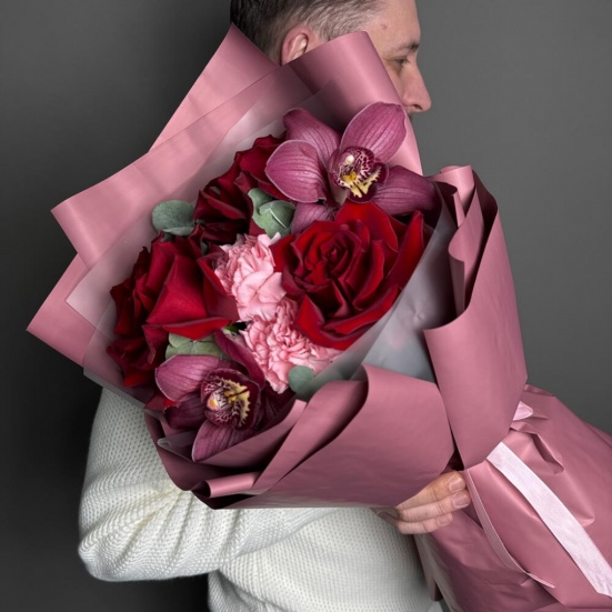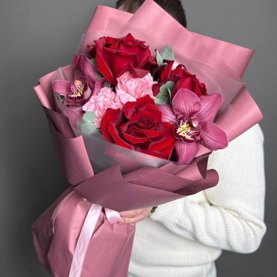 Букет из 3 красных роз, орхидей и диантуса в Пензе